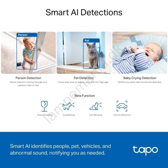 • Optagelse kan ske lokalt på microSD-kort (understøtter op til 512 GB) eller via cloudlagringstjenesten Tapo Care.