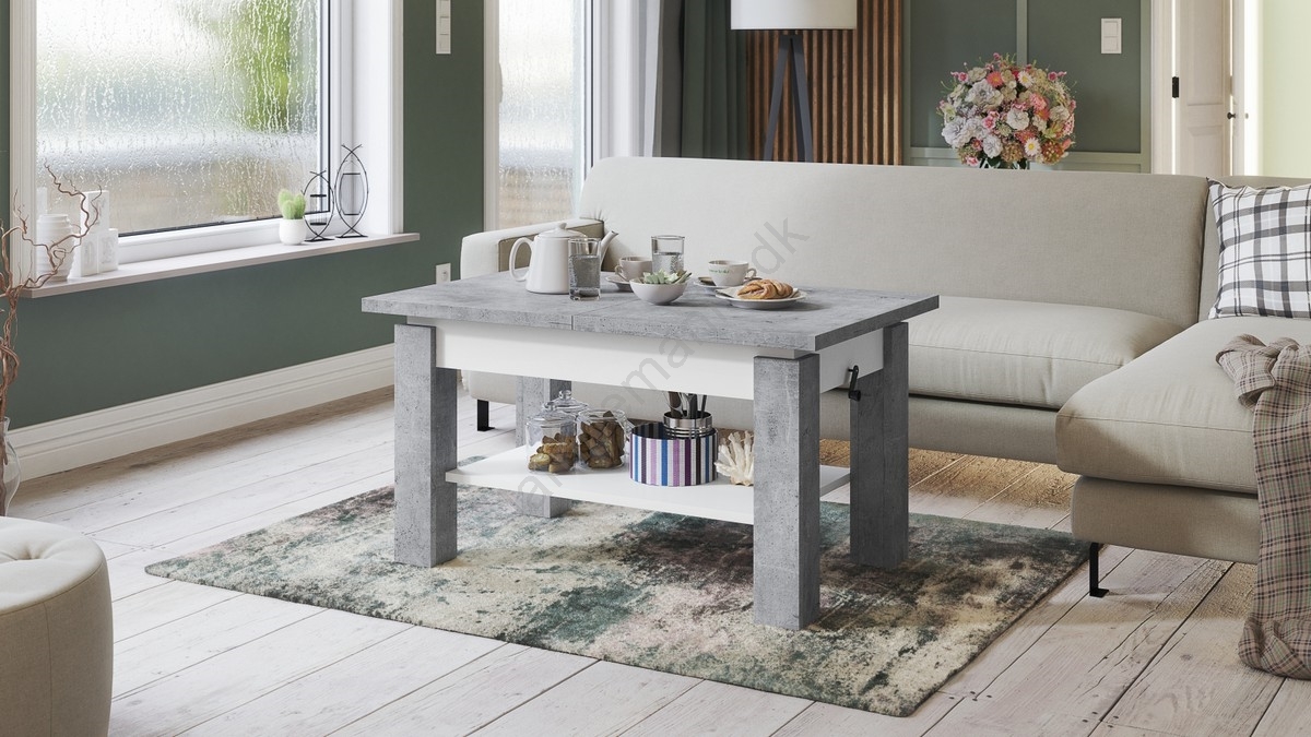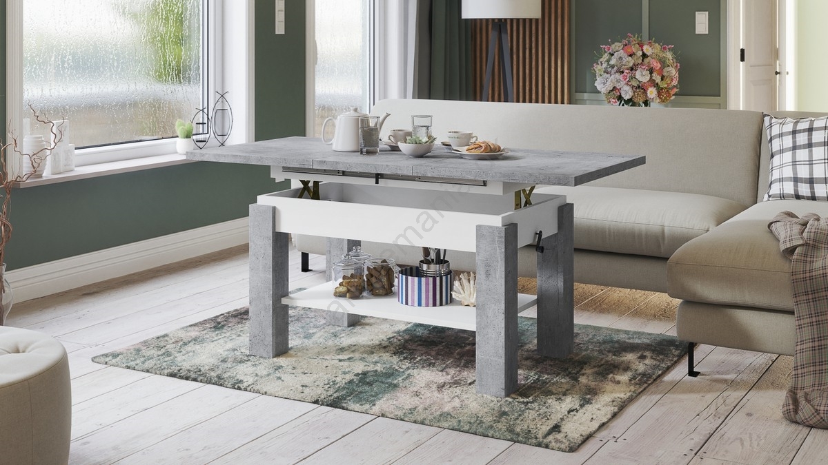 • Udtrækkeligt sofabord/spisebord med hylde ADONIS betongrå/hvid