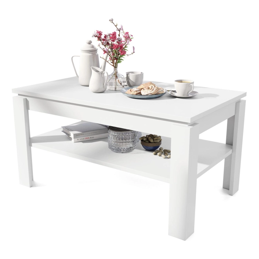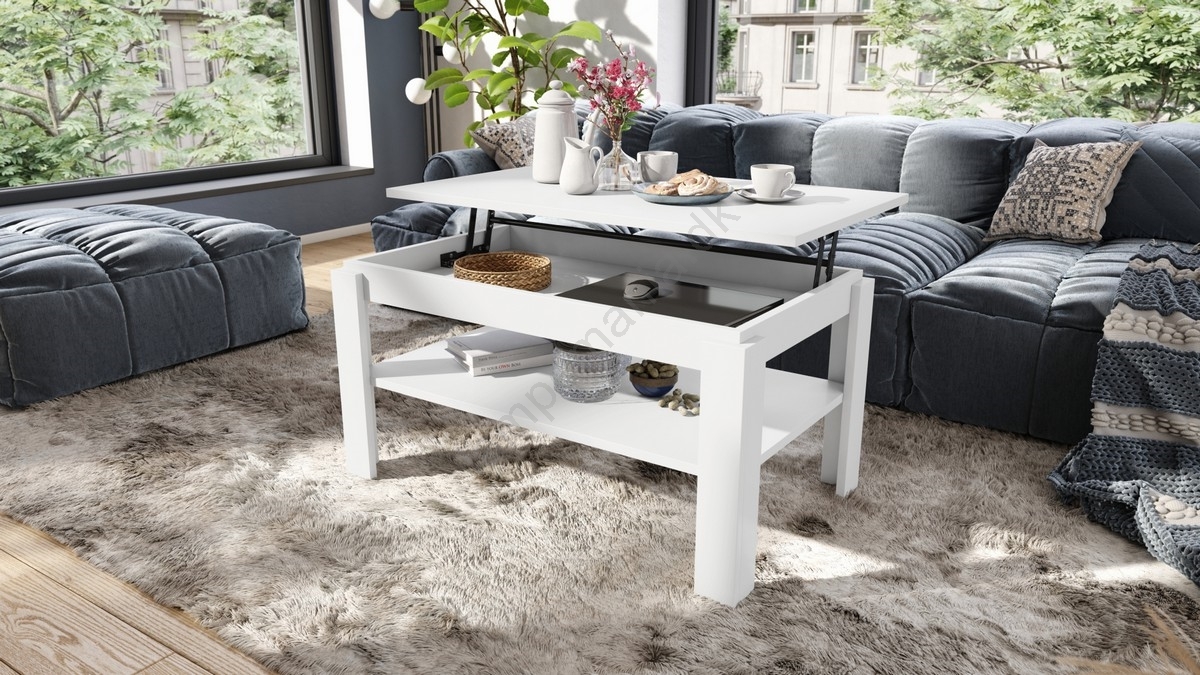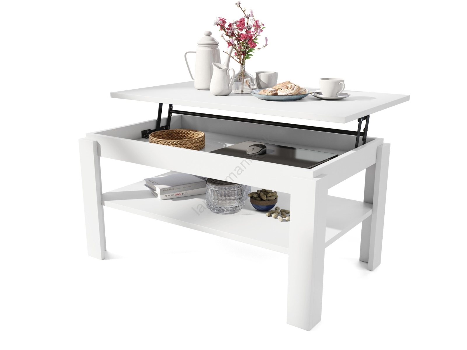• Udtrækkeligt sofabord med løftbar bordplade og hylde ADEN hvid