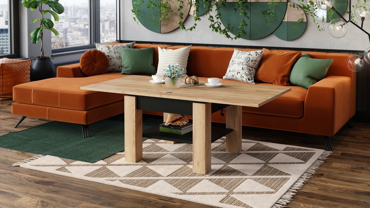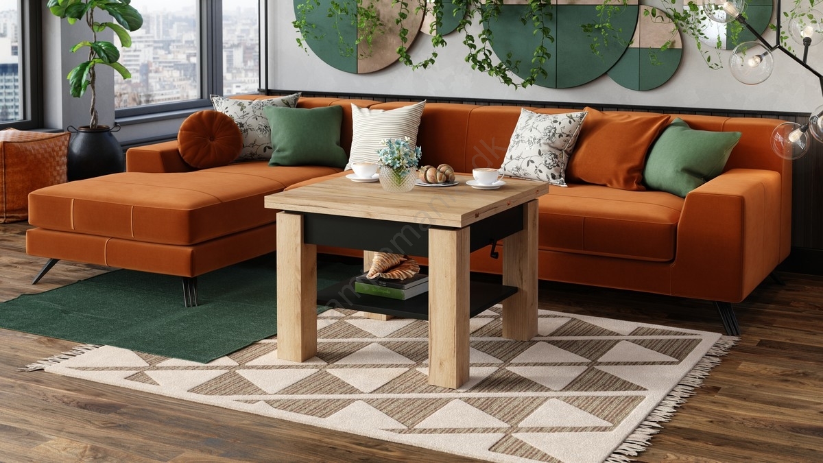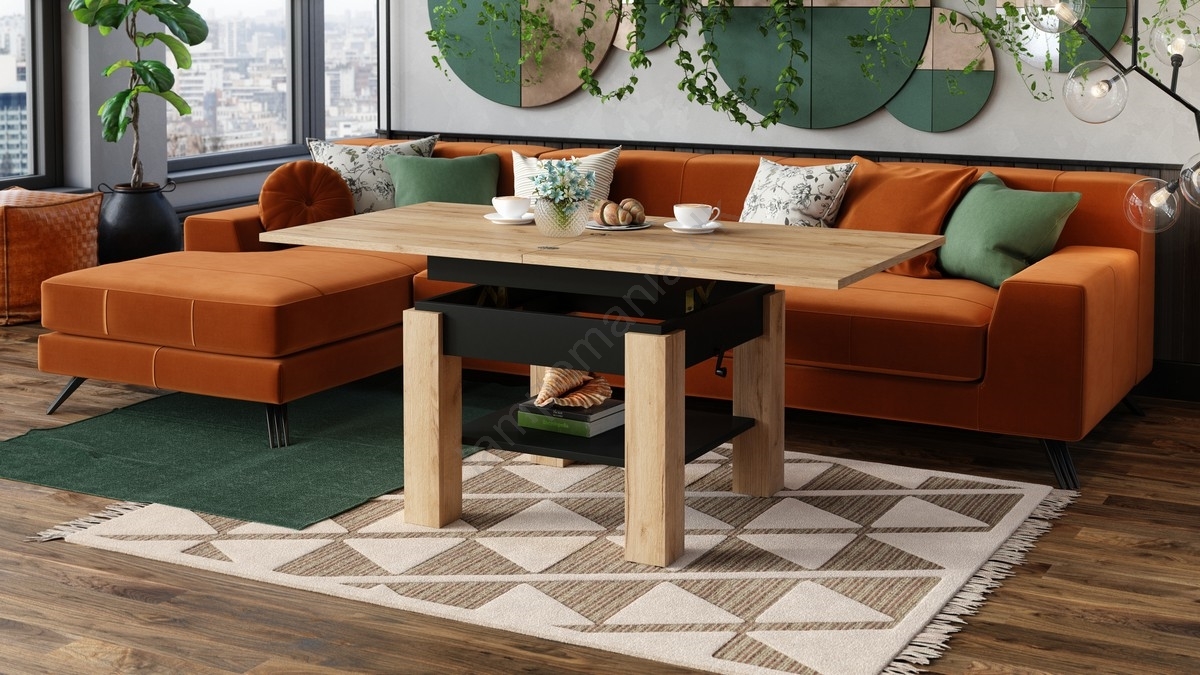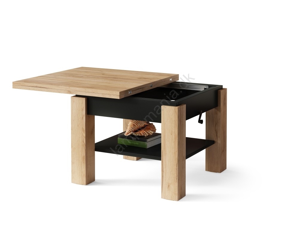• Udtrækbart sofabord/spisebord med løftbar bordplade CALEB eg craft/sort