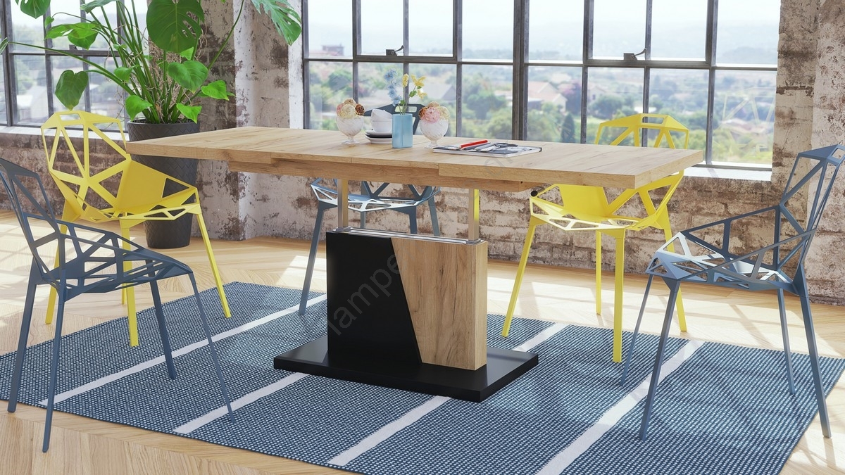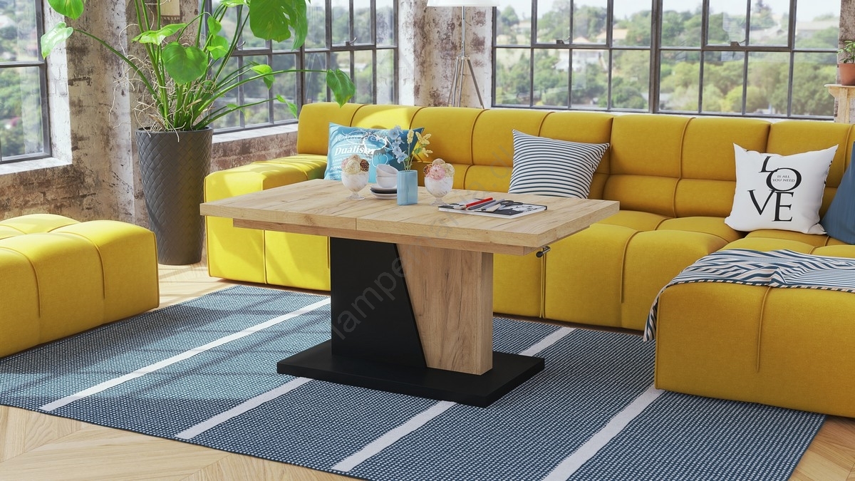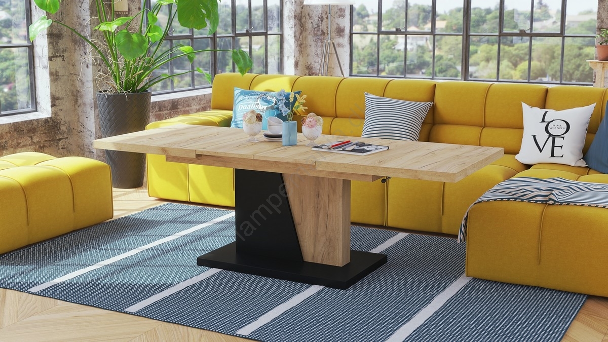 • Udtrækkeligt sofabord/spisebord med løftbar bordplade NINO Craft-eg/sort