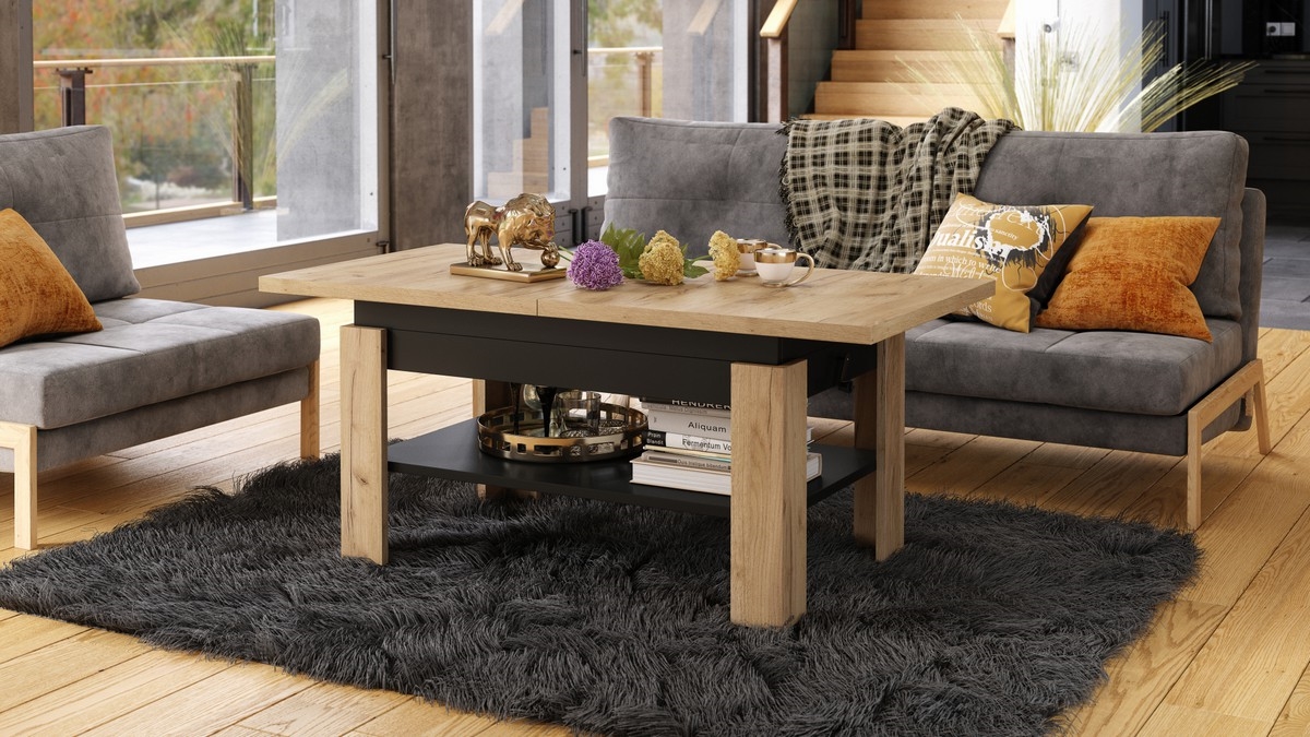 • Udtrækkeligt sofabord/spisebord med løftbar bordplade ROY craft-eg/sort