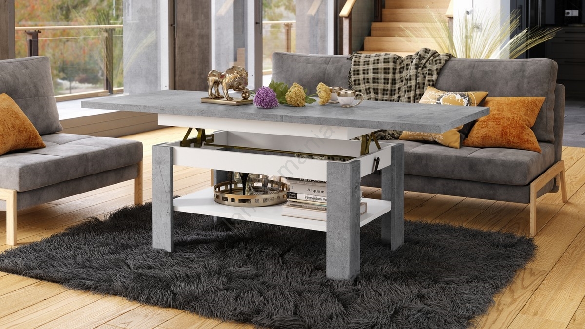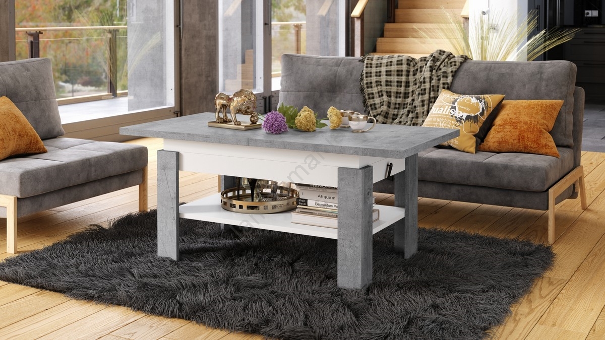 • Udtrækkeligt sofabord/spisebord med løftbar bordplade ROY betongrå/hvid