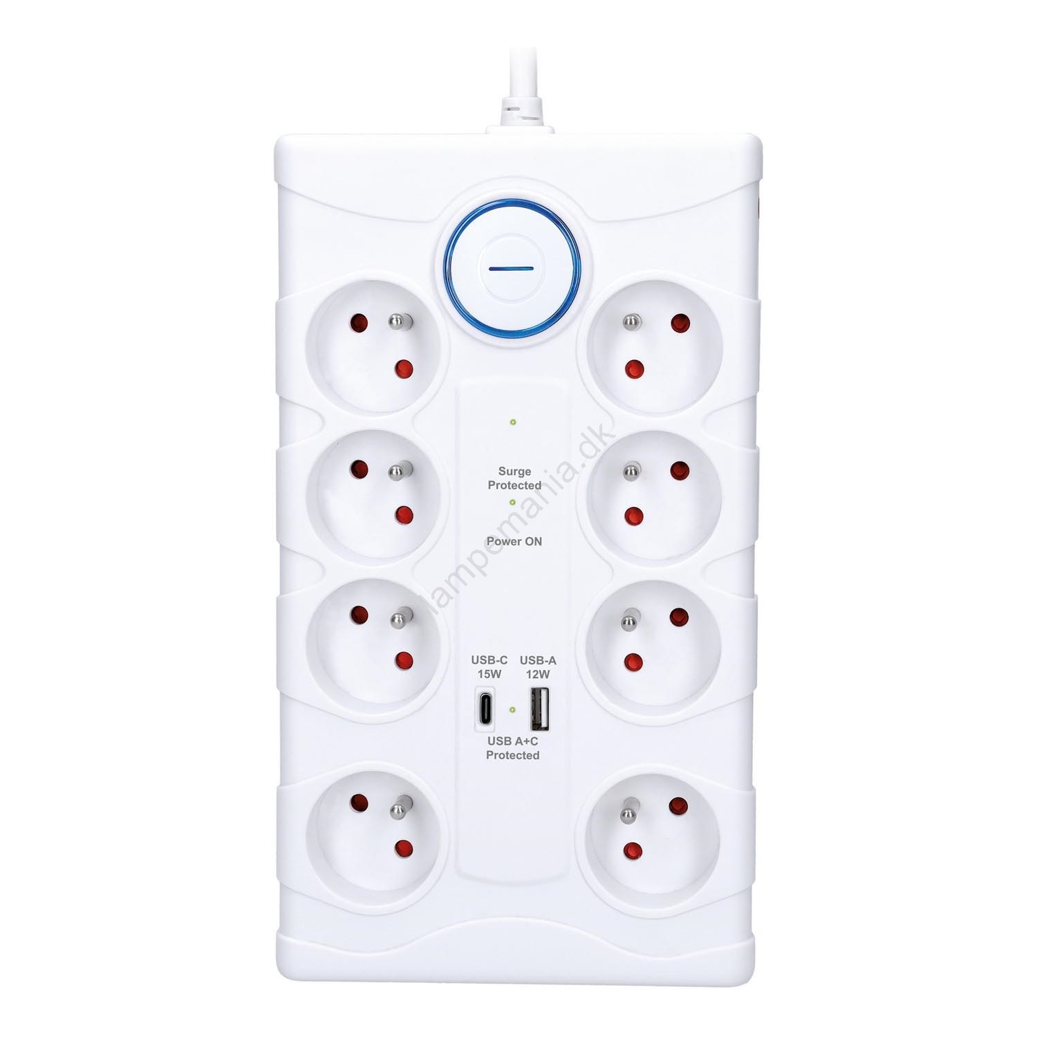 Forlængerledning med afbryder, 8 udtag, Type E + 1x USB-A + 1x USB-C, 2 m, hvid