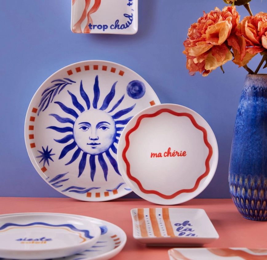 Spisesæt 12 dele rød/blå/hvid/porcelæn