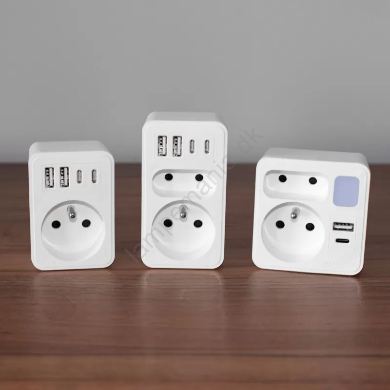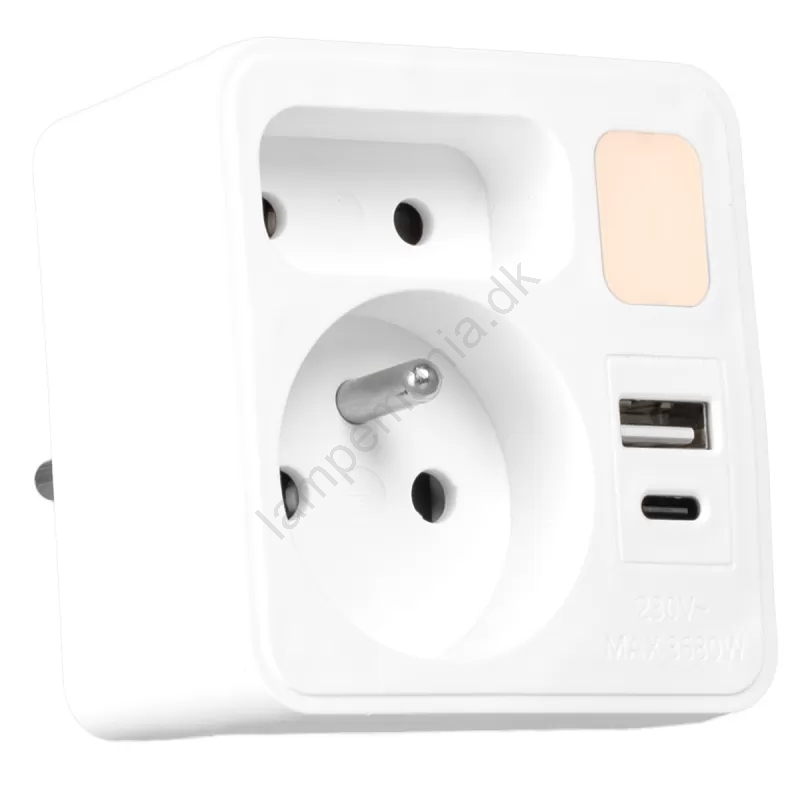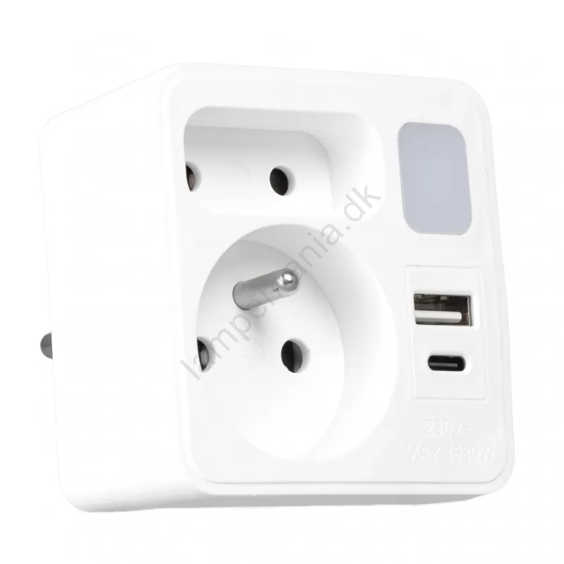 • Multifunktionelt 3-i-1 produkt: forgreningsdåse, oplader og natlampe.