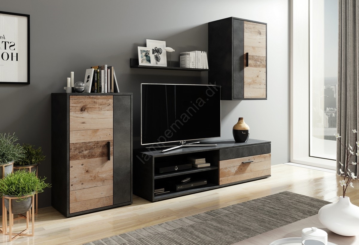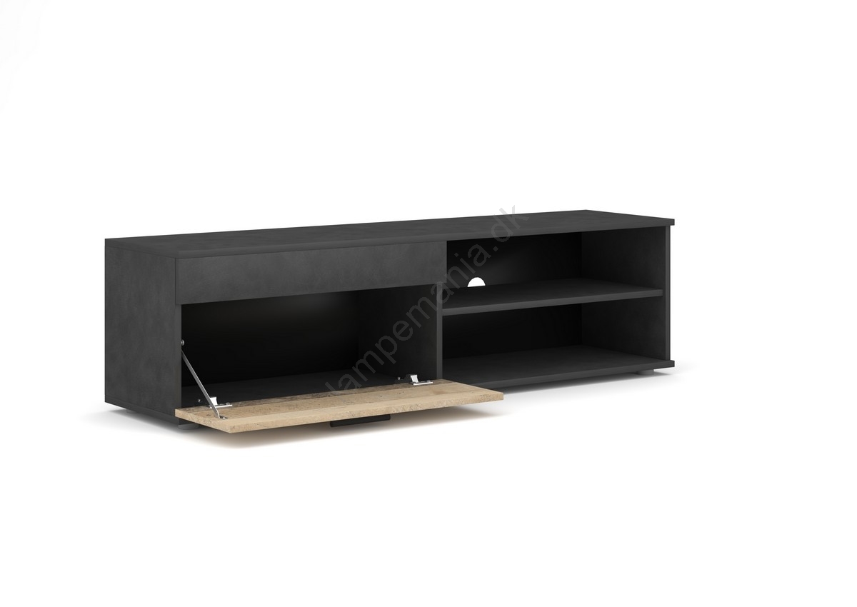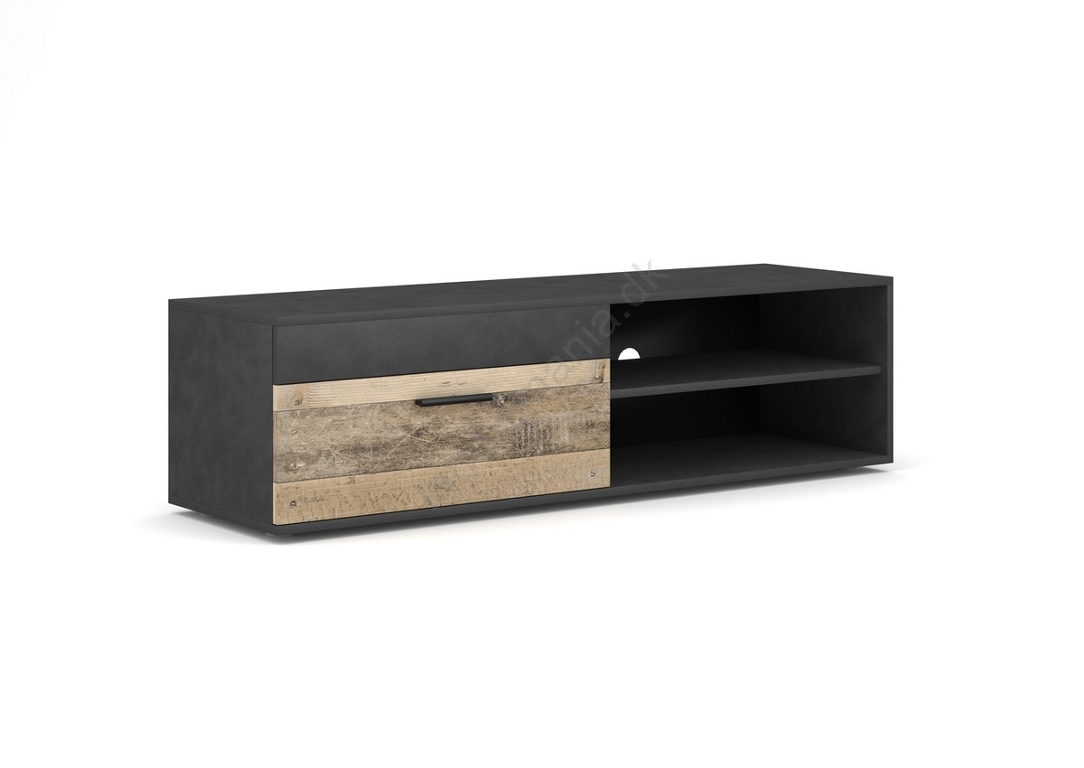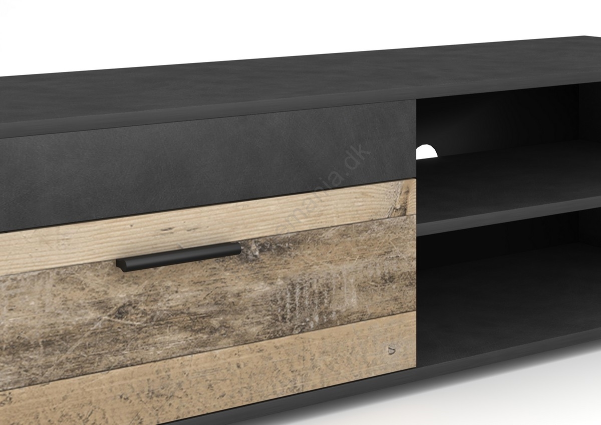 • Inkluderet er et rummeligt tv-bord med åbne hylder til medieudstyr og lukkede rum til skjult opbevaring.