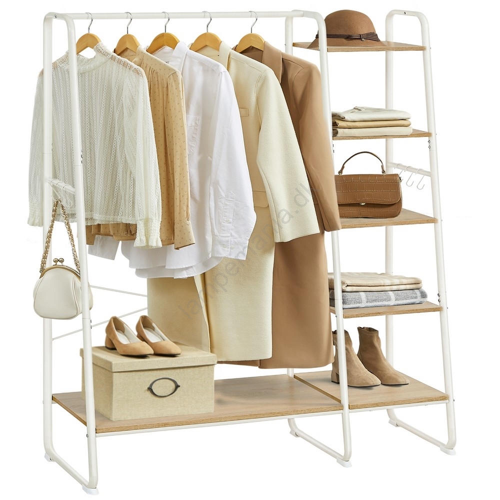 • Hæng jakker, skjorter og bukser på den fuldlængde øverste stang, og opbevar tasker, sko, kasser,  hatte, tørklæder, paraplyer og andre nødvendigheder på de 6 opbevaringshylder.