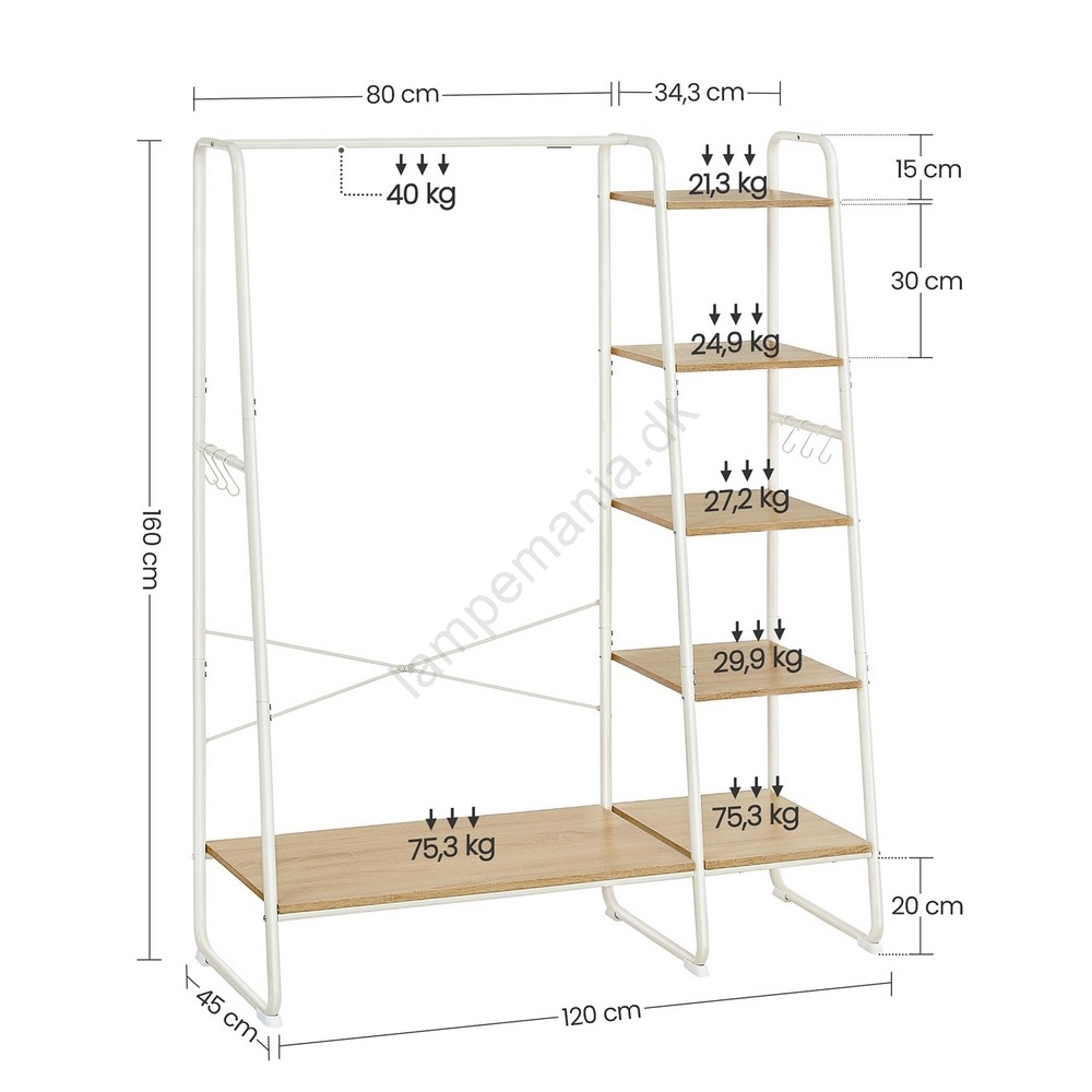 • Der følger desuden 6 S-formede sidekroge med i pakken, som kan hænges på stativets sider, så dit tøj, sko, tasker, dekorationer og planter får den perfekte plads.