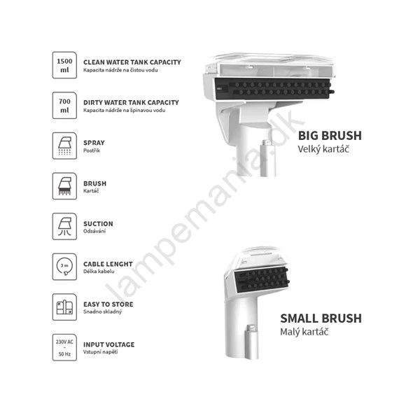 • Den er designet til grundig rengøring af tæpper, polstrede møbler, madrasser og bilinteriører.