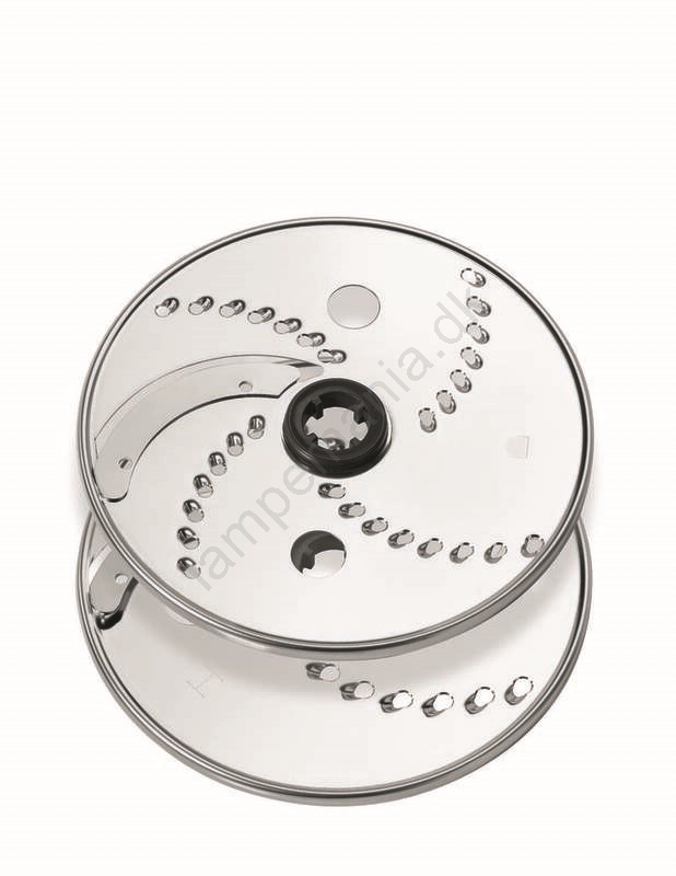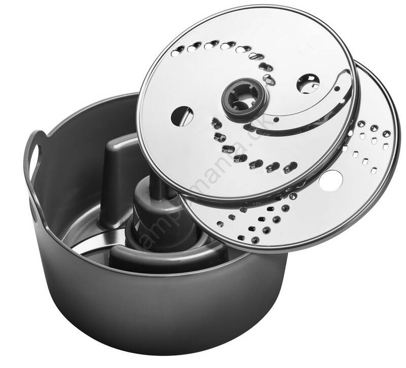 • Den er udstyret med et bredt udvalg af specialiserede og effektive redskaber: kniv med titanbelægning til hakning og skæring af alle slags ingredienser, to udskiftelige rustfri stålskiver til grov rivning/skæring og fin rivning/skæring af grøntsager eller ost, blenderbeholder til at blende lækre supper, juicer og smoothies, hakker til finhakning af løg, hvidløg og krydderurter, piskeskive til flødeskum til desserter og emulgering af saucer.