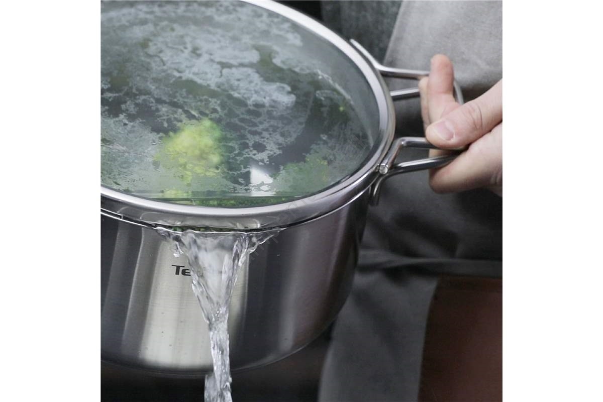 • Praktiske hældetud med små huller på hver gryde gør det muligt at si direkte (f.eks. pastavand).