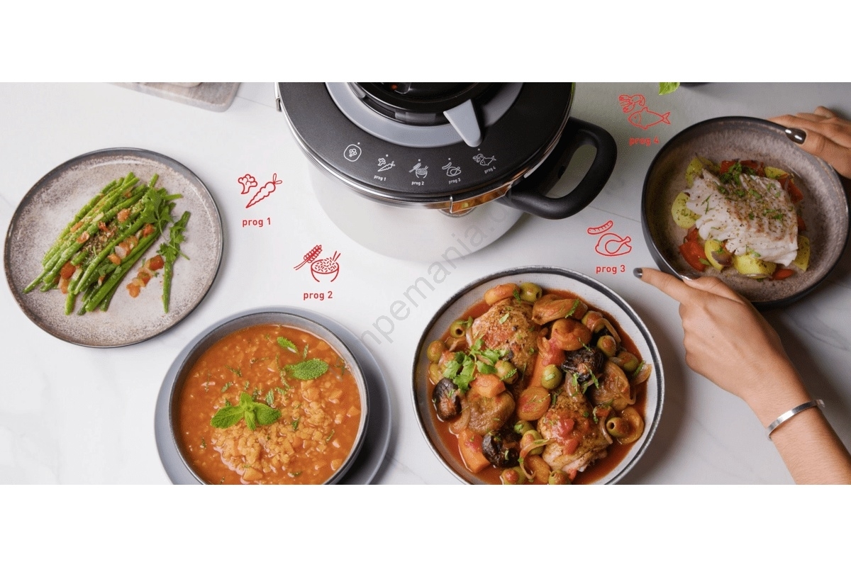 • Trykgryden har 4 forindstillede programmer (grøntsager, korn/bælgfrugter, kød, fisk), som gør det nemt at tilberede forskellige typer mad.