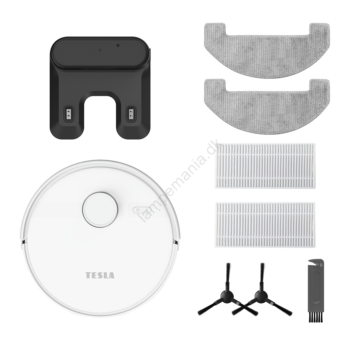 • Indhold i pakken: intelligent robotstøvsuger med lasernavigation, 2-i-1 beholder til støv og vand, ladebase, hovedbørste, sidebørste (2 stk.), vaskbart HEPA H13-filter (2 stk.), primærfilter, skumfilter, mopholder, mikrofiber-mopklud (2 stk.), rengøringsbørste med skraber.