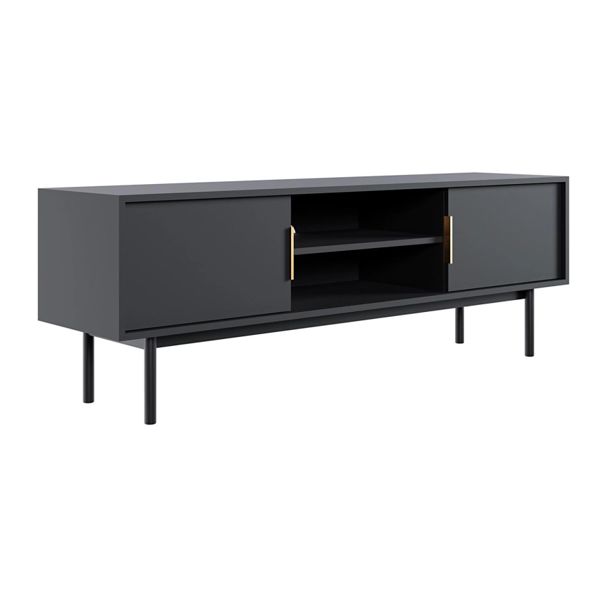 • Det har to lukkede sideskabe og to åbne hylder, hvoraf den ene midtfor har en kabelgennemføring.