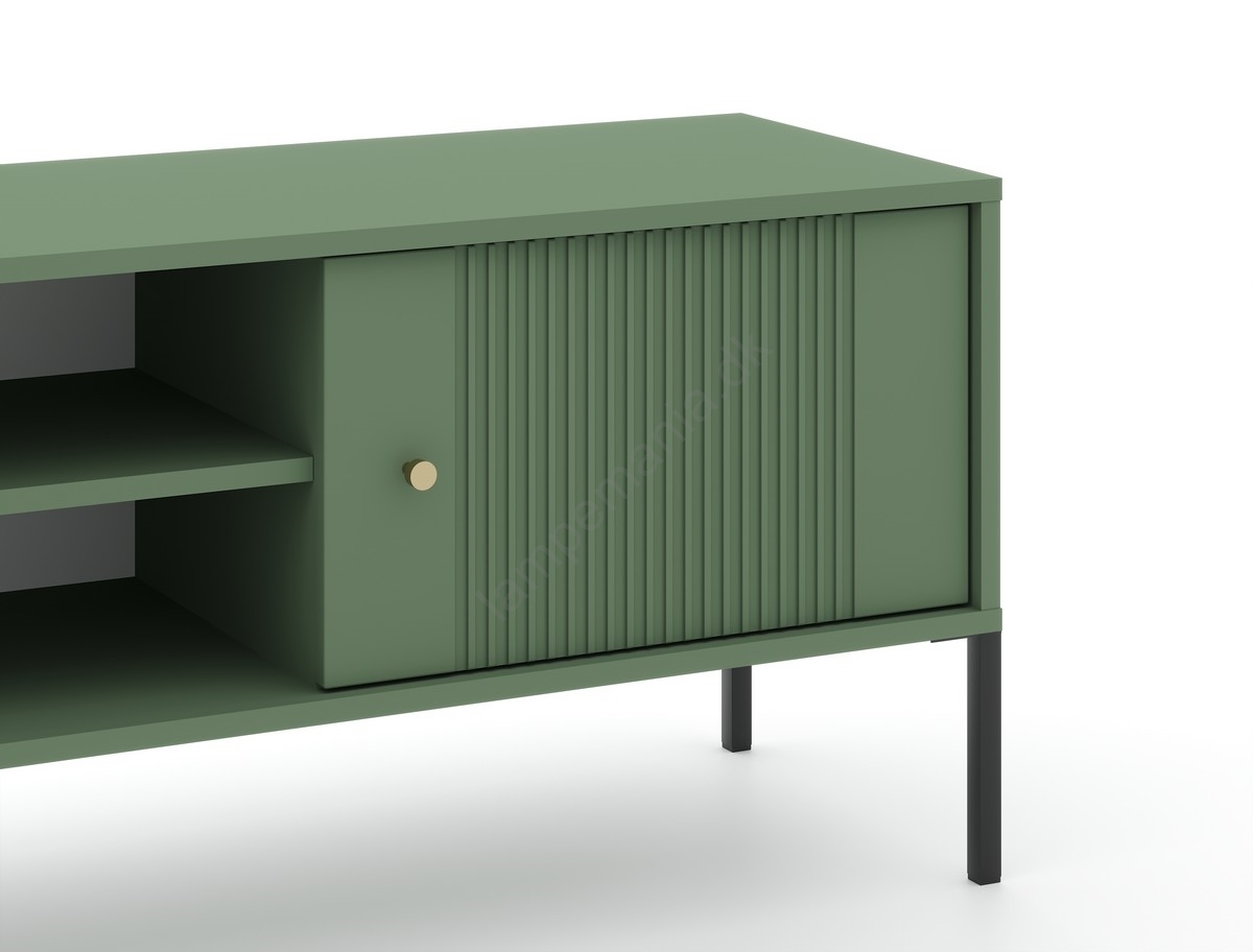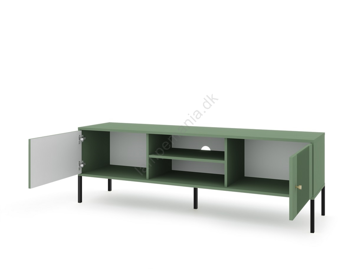 • Den har to lukkede sideskabe med ribbet front og to åbne hylder, hvoraf den ene i midten har en kabelgennemføring.
