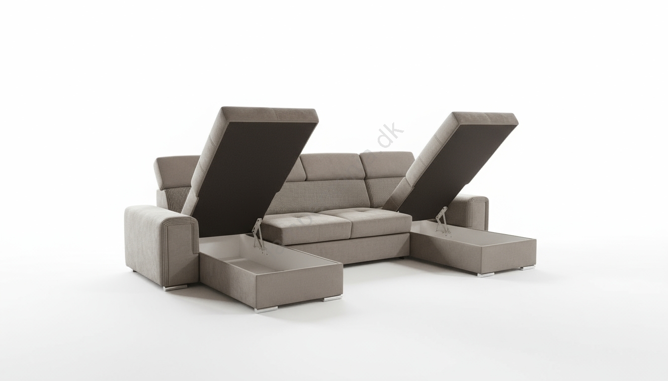 • Udtrækbar U-formet hjørnesofa med vendbart hjørne og opbevaringsplads SALVADA beige