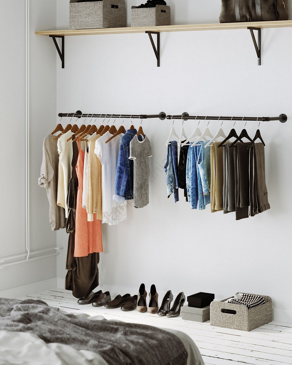 • Takket være 30cm afstand mellem væggen og den hængende stang er der rigelig plads til de fleste bøjler og beklædningsgenstande.