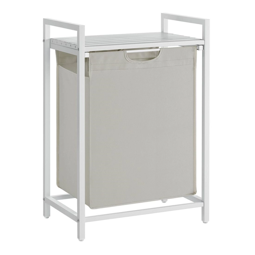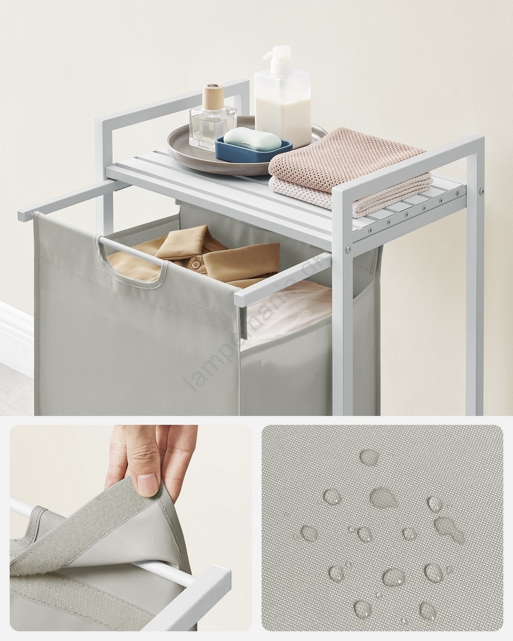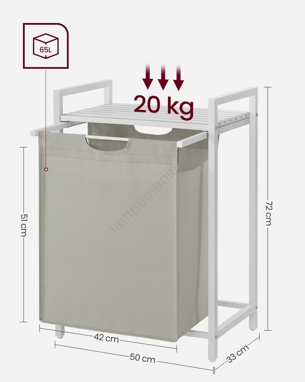 • 1 pose, 1 hylde – Opbevar vasketøjet i stofposen (65 l) og placer vaskemidler, skyllemiddel og andre ting på hylden over.