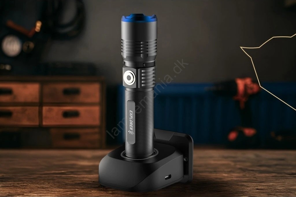 • Opladning via USB-C dockingstation, som medfølger og gør det nemt at placere og oplade lommelygten.