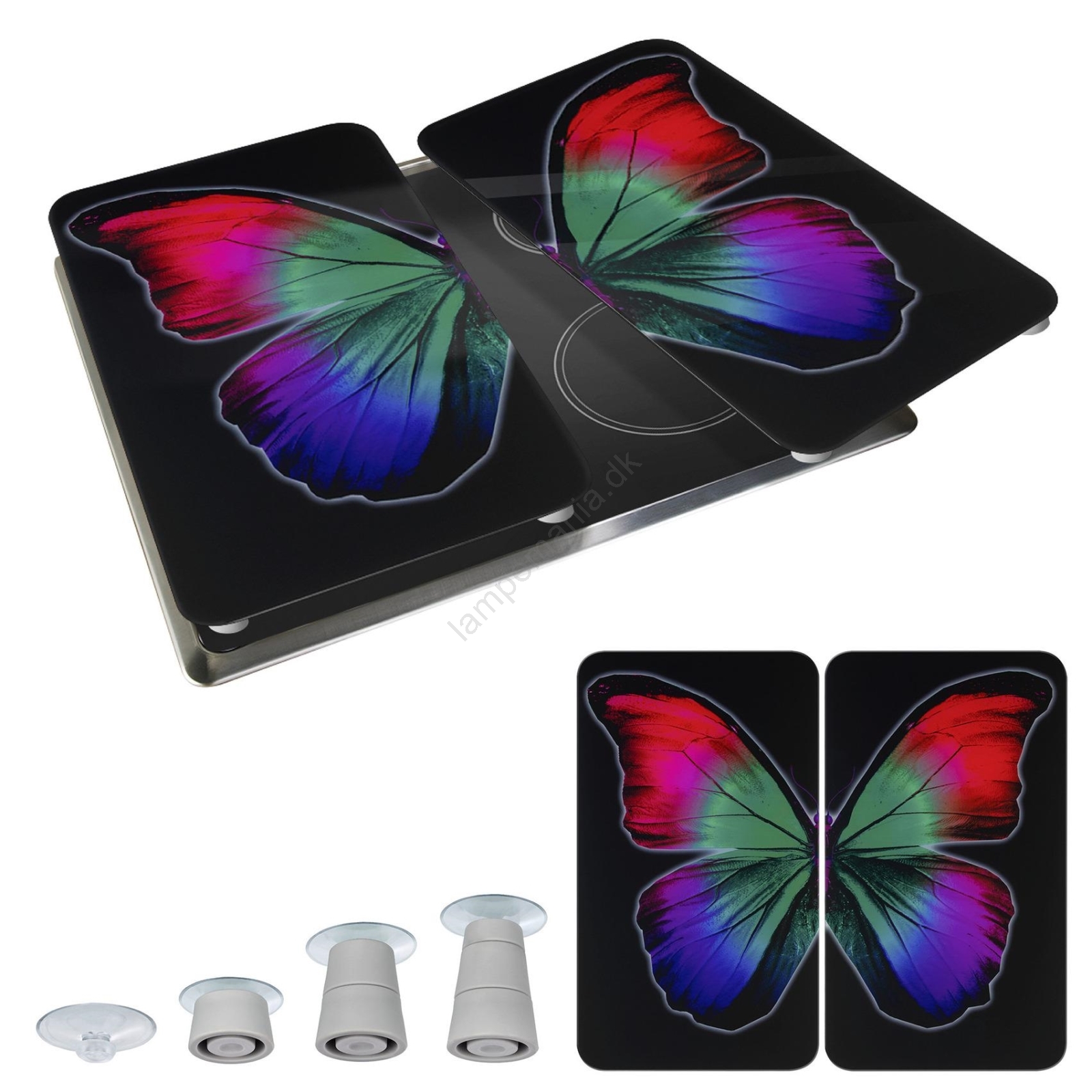• Elegante glasdæksler med sommerfuglemønster til et moderne køkkenlook.