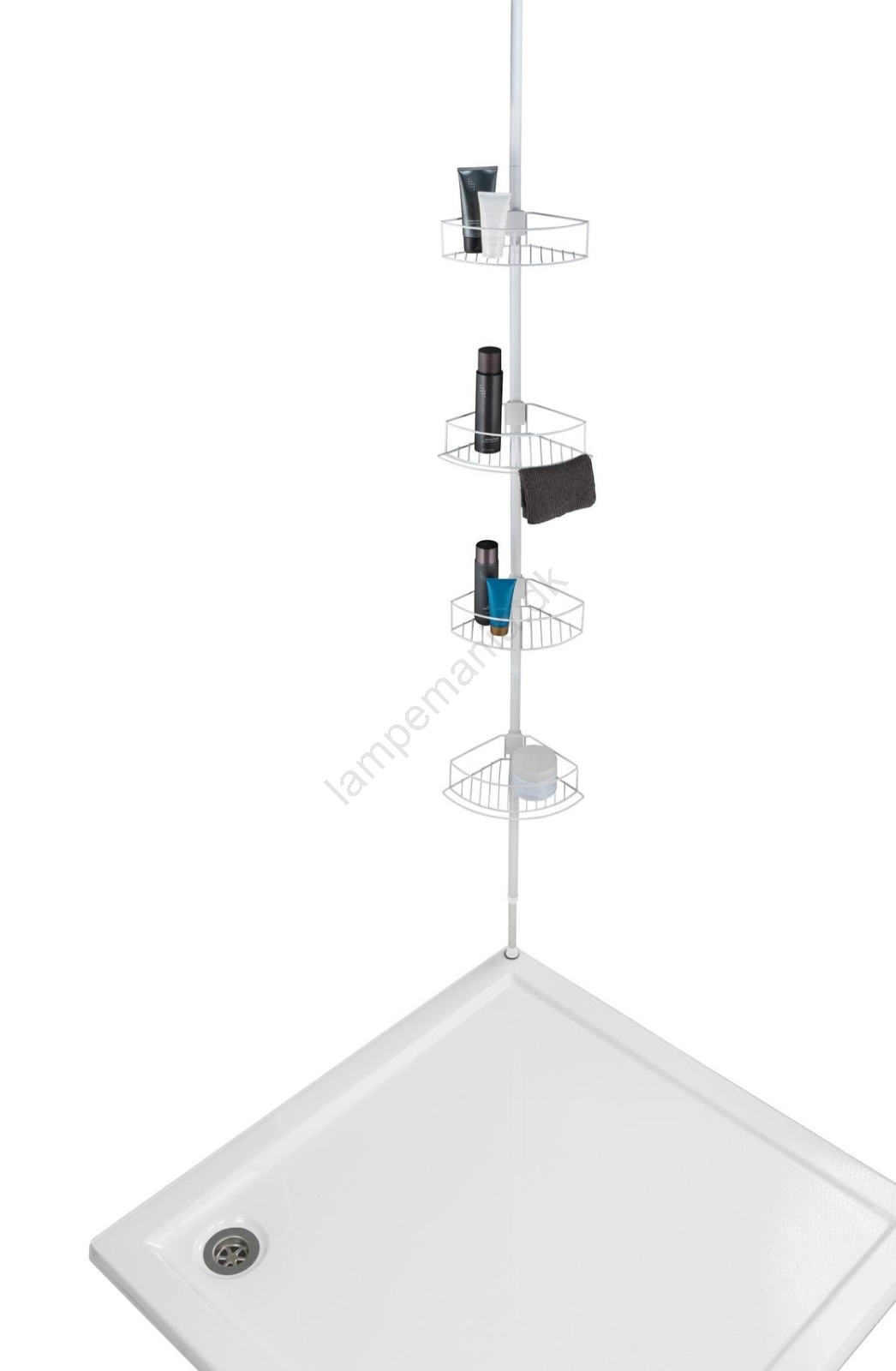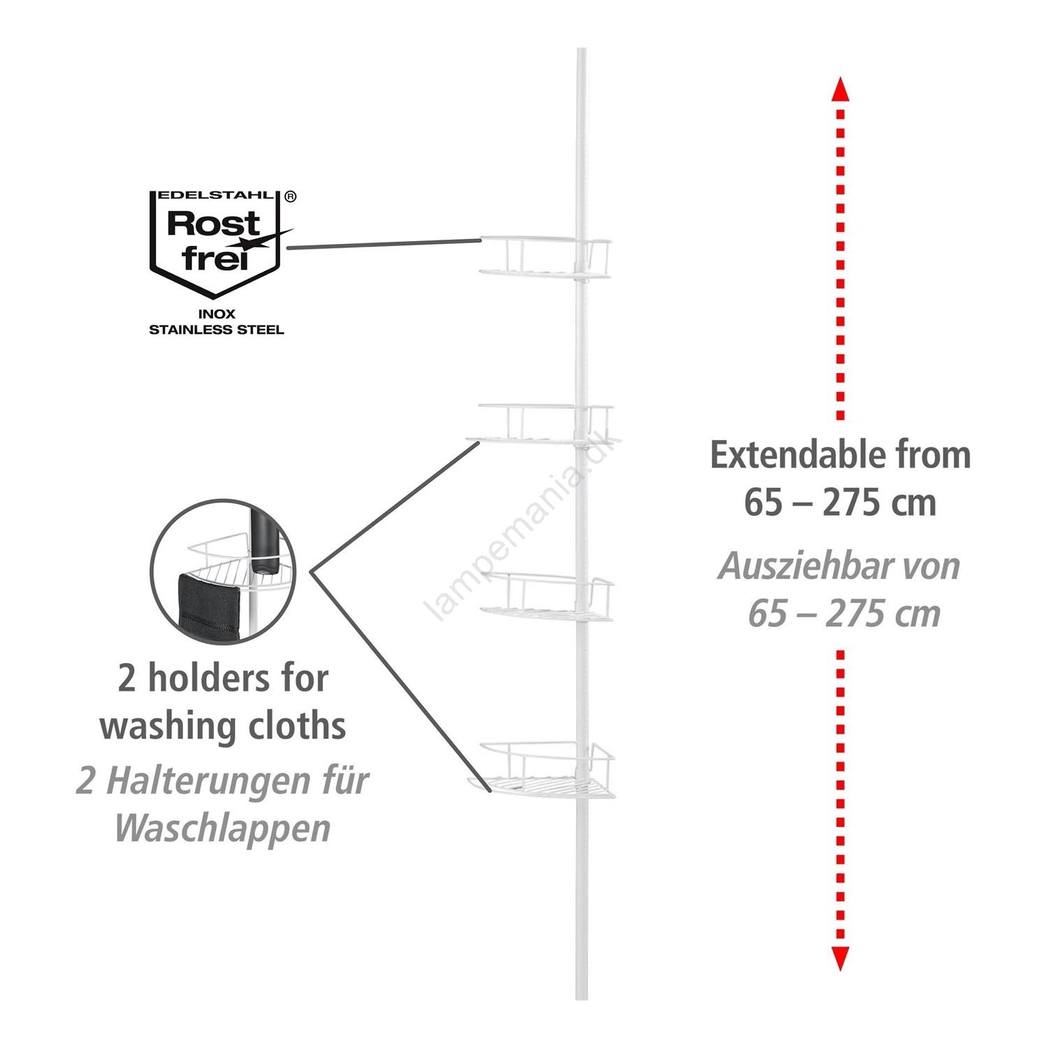• Teleskopisk hjørnehylde i rustfrit stål med mat hvid overflade.
