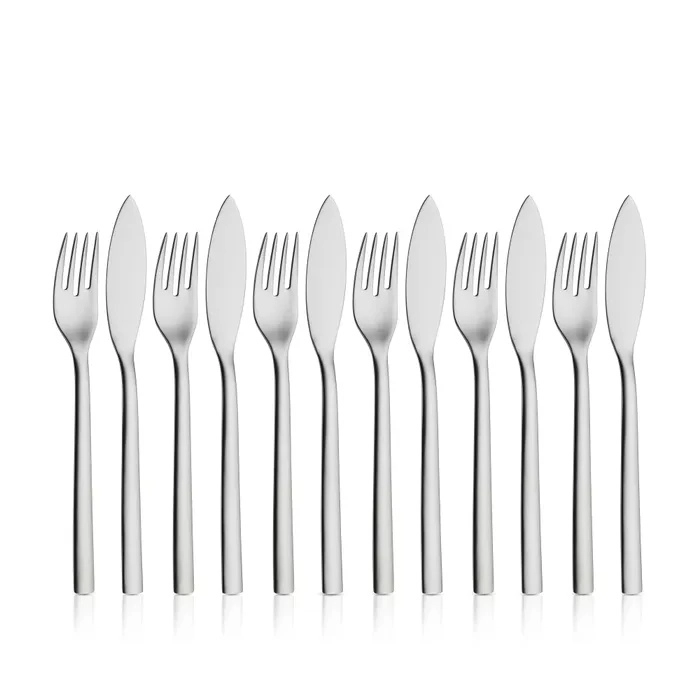 • Specielt sæt med 12 bestikdele designet til servering af fisk – indeholder 6 fiskeknive og 6 gafler.