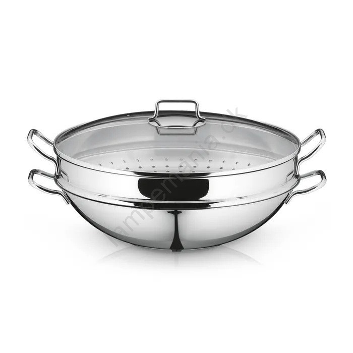 • Komplet 4-delt sæt: Sættet indeholder en wokpande med en diameter på 36 cm, et glaslåg, en perforeret dampindsats og en rustfri varmerist til at holde retterne varme.